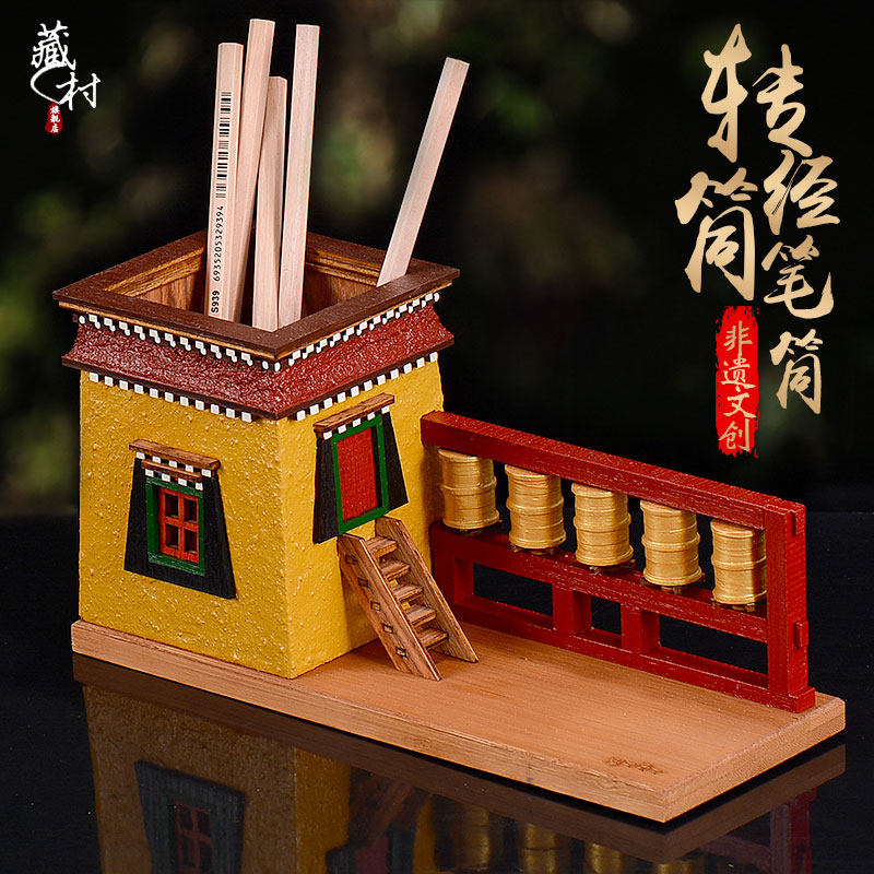 藏村藏式转经筒笔筒家用办公室非遗建筑文创手工实木彩绘创意摆件热门设计联盟服务商