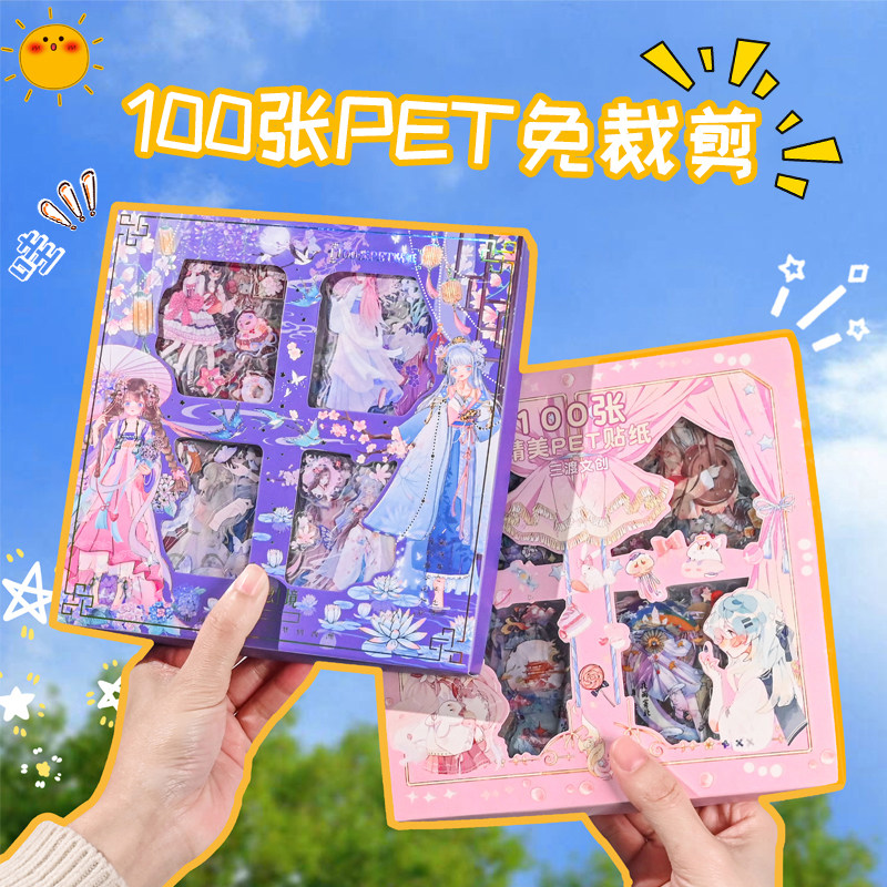 古风手账贴纸日系100张防水免裁剪PET手帐贴纸韩版少女心人物装饰素材ins风自粘贴画diy手机壳卡通拼贴小图案热门设计联盟服务商