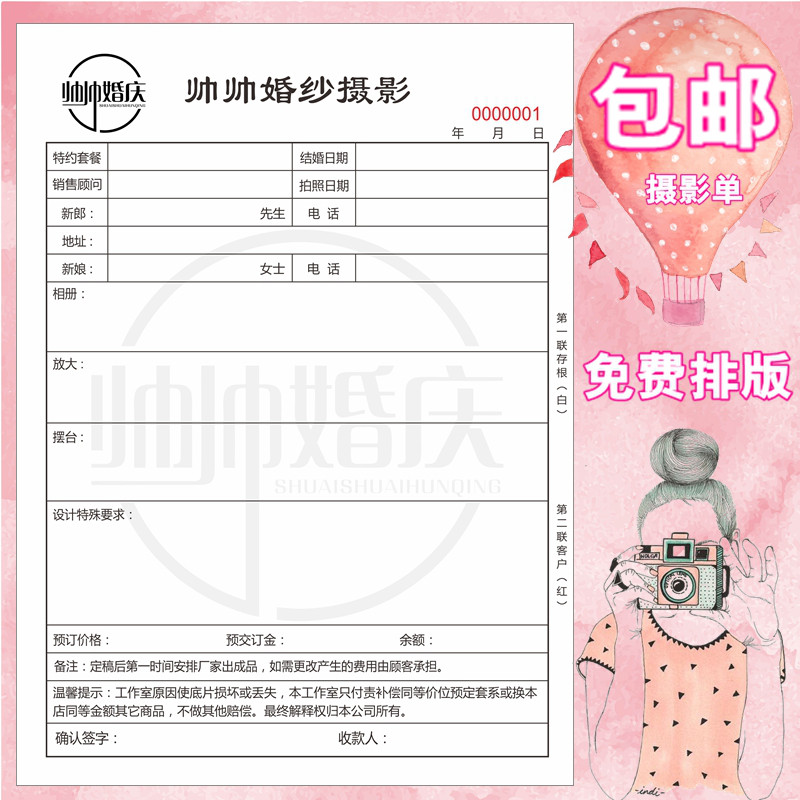 婚纱影楼摄影单预约单拍摄选样单签约单据复写收据婚礼跟拍押金单热门设计联盟服务商