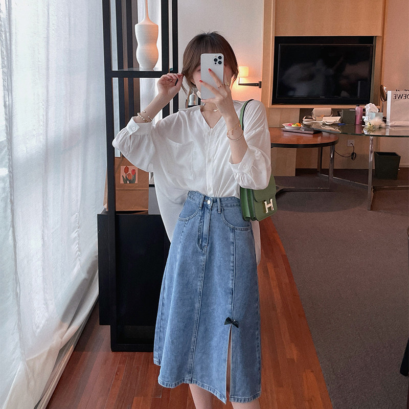 不规则开叉牛仔半身裙女2021夏季小个子蝴蝶结中长款设计感a字裙热门设计联盟服务商