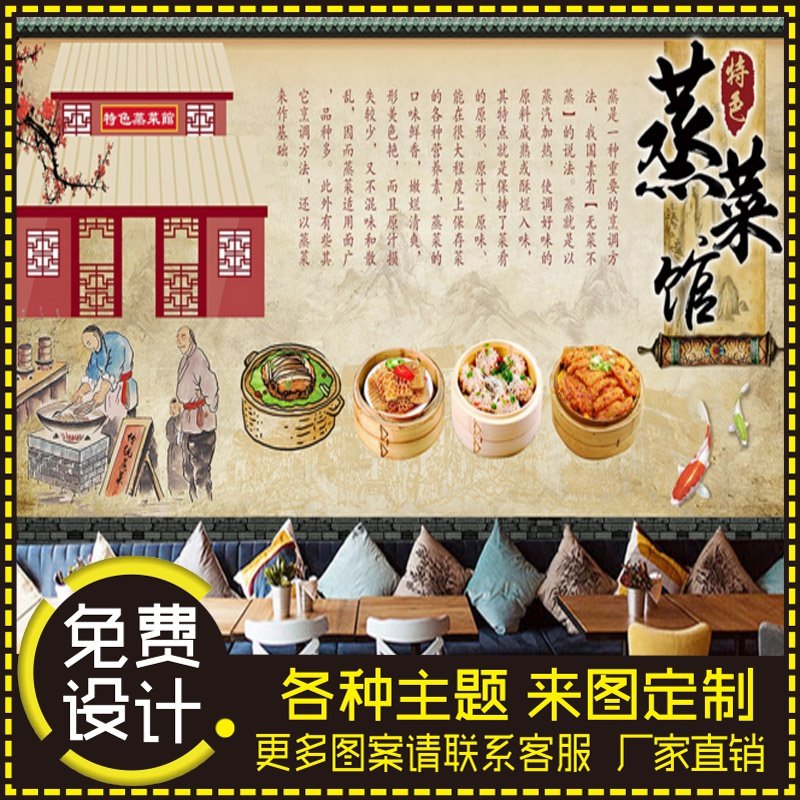 蒸菜馆饭店装修壁纸传统蒸碗家常菜小饭馆餐馆墙面装饰墙纸用壁画热门设计联盟服务商