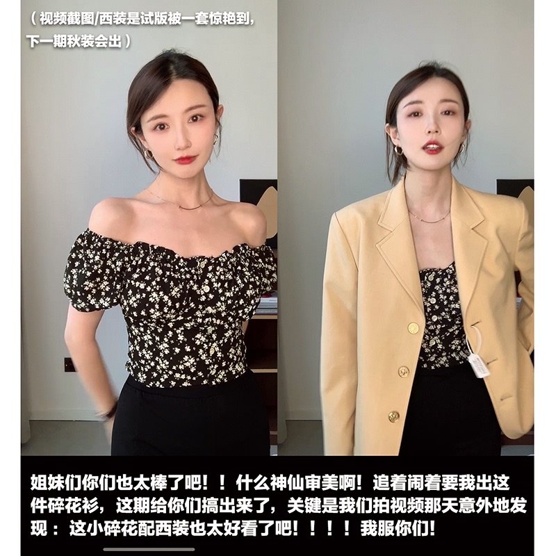 bigyu 碎花一字肩短款衬衫 女夏薄款法式甜美小众设计感短袖上衣热门设计联盟服务商